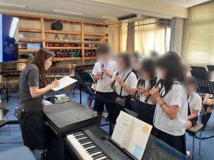 6年生は音楽の学習です。リコーダー曲「サウンドオブニュージック」を音符や休符の長さを意識しながらグループで演奏しました。