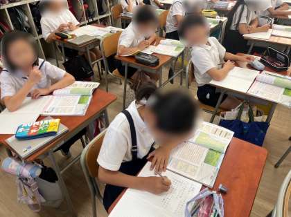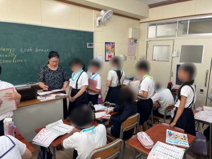 6年生は外国語の学習です。一日の中で家のお手伝いをしていることを英語で書きました。上手く英語で書けているかルース先生に見てもらいました。
