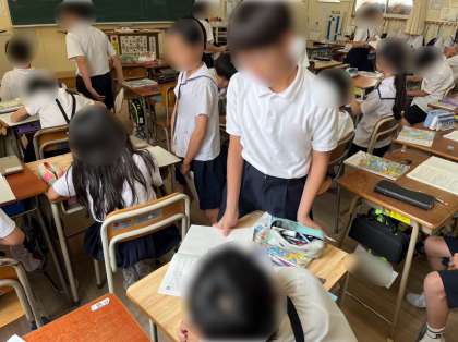 5年生は算数で「2つの量の変わり方」の学習をしています。マッチ棒で作った正方形を増やしていくときの正方形の数と棒の数の関係を調べ、わかったことを交流しました。考えの根拠を示して伝え合っている姿が大変立派です。