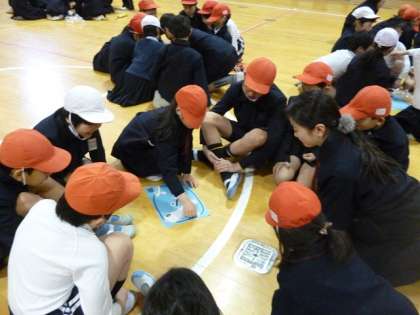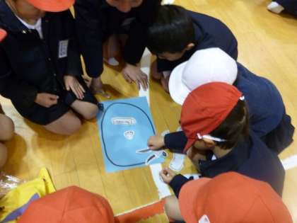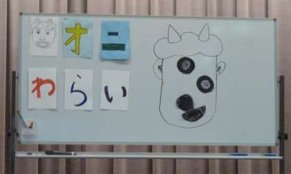 2月12日(金)の児童集会で「オニわらい」をたて割り班でしました。赤白帽子で目隠しをして鬼の目や鼻を貼り付けていきます。