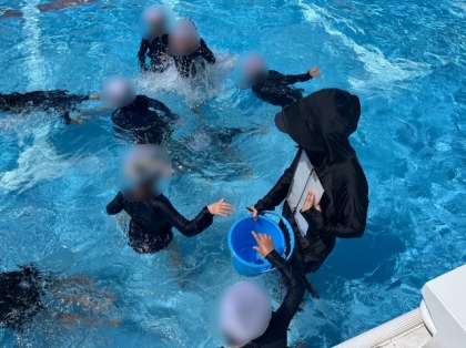 1年生はプール水泳です。1年生はこわがらずに水に顔をつけることが大きなステップです。今日も宝探しをしながら水に顔をつける練習をしました。