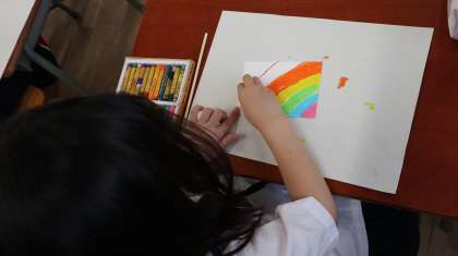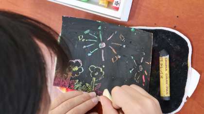 パスを使ってスクラッチアートに取り組みました。スクラッチアートとは、黒い表面を削ることで、下から現れるカラフルな色やホログラムを楽しむアートです。子ども達は、白い画用紙に明るい色と、その上に黒色を重ね、割り箸でひっかいていきました。割り箸でひっかくと、明るい色が次々と出てくるので「きれい!」と、喜びながら絵を描いていました。