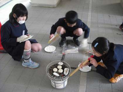 火をおこした後は、七輪で焼いた餅や干芋をおいしくいただきました。