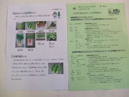 講習会では、中央区役所の方から「玉造黒門越瓜」をはじめとした中央区発祥のなにわの伝統野菜のお話を聞きました。また、地域にあるレストラン「リール」のシェフに来ていただき、玉造黒門越瓜を使った料理2品「国産鶏肉のスパイスローストと玉造黒門越瓜のハーブライスと玉造黒門越瓜のピクルスのソース」「玉造黒門越瓜のピクルスとトマトのジュレとベーコンの冷製スパゲッティ—」を試食させていただきました。