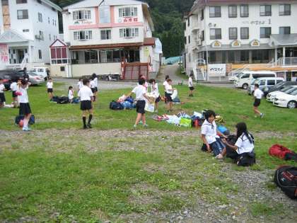 写真上は、1日目の昼食後の様子です。後ろの建物が宿泊所の「山水館」です。