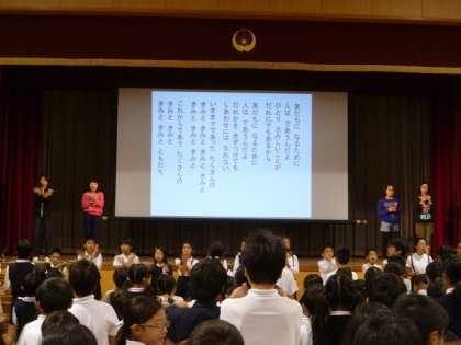 写真中は、開会式で中央聴覚支援学校の友だちと一緒に「友だちになるために」の歌を手話を交えて歌っているところです。