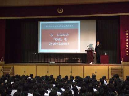 「ゆめのおはなし」の後半は、「勉強って何のためにするの」というテーマでした。時折、フロアーに下りて子どもたちへのインタビューを交えながら、「『自分の夢を見つけるため』たくさん勉強して、楽しいことをたくさん見つけてください」というお話をしていただきました。