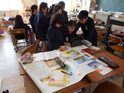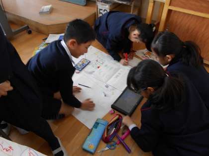 3年は、国語科「町について調べてしょうかいしよう」の学習のまとめとして、玉造稲荷神社や越中井などについてパソコン室やタブレット端末などを活用して調べたことを壁新聞にまとめています。