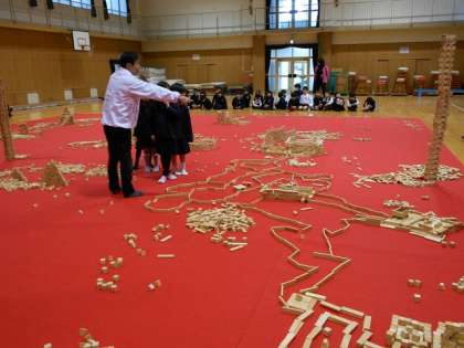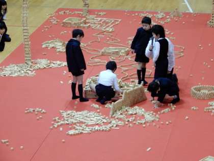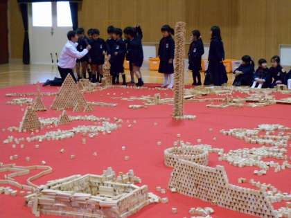2月18日の土曜授業で、1年は公益財団法人オイスカの方に来ていただき、つみ木広場で遊びました。グループで思い思いにつみ木を積み上げたり、横に並べたりして作品を仕上げていました。最後に紙芝居で森の大切さについて学びました。