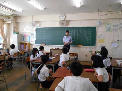 写真は上から、数学「数について考えよう!」、国語「チームで勝負!!〜新聞を復元しよう〜」、理科「実験を楽しもう」、の様子です。その他にも、社会「都道府県を覚えよう」、保健体育「体つくり・運動と集団行動を学ぼう!」、技術・家庭「プログラミング実習」の体験学習をしました。
