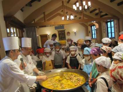 スペイン村では、まず、昼食のパエリア作りを体験しました。シェフの説明をよく聴いてグループごとにパエリアを作って食べました。