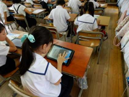 写真は、2年が生活科でザリガニの観察記録をするのにタブレットのカメラ機能を使っているところです。