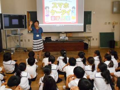 7月3日(月)4・5・6年は、NTTドコモの方にいていただき、情報モラル教育として「スマホ・ケータイ安全教室」を行いました。インターネットを通じて知らない人とのやりとりの危険性などをわかりやすく教えていただきました。