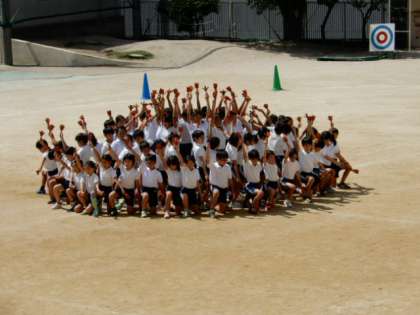 5年生は、本番では自分のお気に入りの一文字を背中に書いたはっぴを着て演技します。