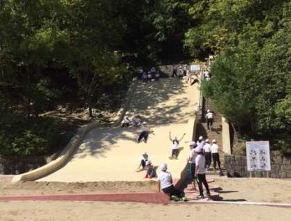 爽やかな秋晴れの下で、大きな滑り台などの遊具で遊んだり、虫やカエルを捕まえたりして自然に親しんでいました。