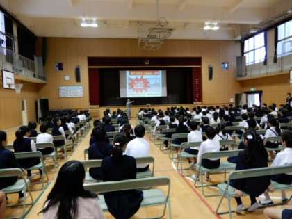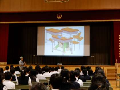 写真は、中央区役所の方による「地震を知ろう」のお話を聞いている様子です。