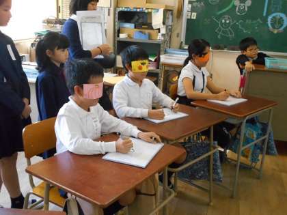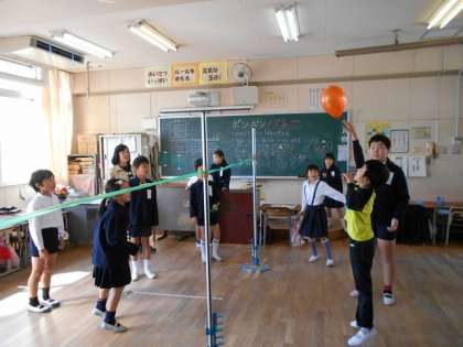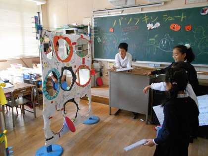 写真は、上から「パンプキン シュート(的当て)」「アイマスク スケッチ(目かくしお絵かき)」「ポンポンバレー(風船バレー)」の様子です。