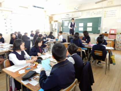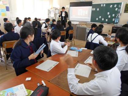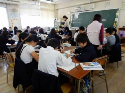写真は、1組が算数科「面積の求め方を考えよう」、2組が外国語活動「Let’s enjoy English!」、3組が算数科「面積の求め方を考えよう」の授業風景です。