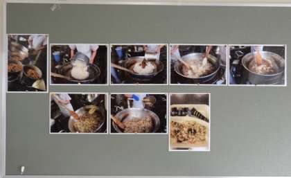 本校では、自校炊飯をしており、給食調理員が炊き上がったご飯に具材を混ぜて児童に給食を提供しています。給食室の掲示版で、その作業工程の様子を写真を掲示して児童に紹介しています。