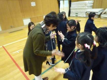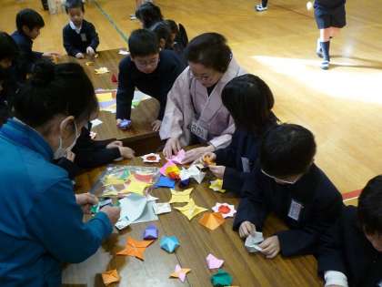 1月16日(火)1年は、地域の女性会の方々に来ていただき、おはじきやお手玉、こま、けん玉、あやとり、折り紙を教えていただきました。女性会の方からコツを教えていただき、上手にできるようになりました。