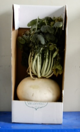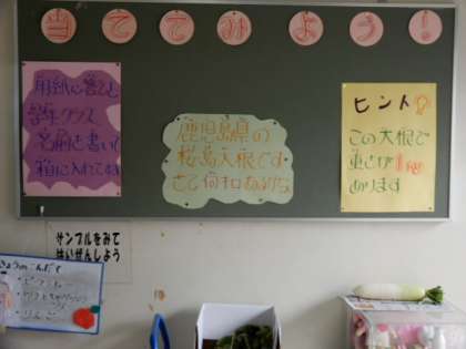 その取り組みの一つとして鹿児島から送ってもらった桜島大根を展示しています。子どもたちは、普通の大根と見比べてその大きさにびっくりしていました。