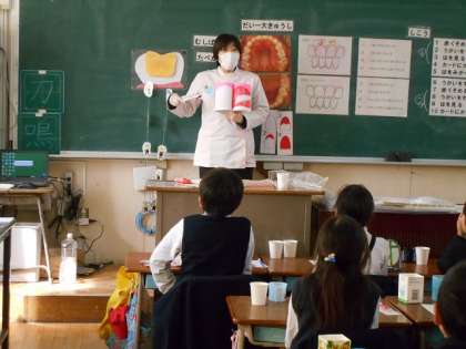 1月31日(水)2年は、歯科衛生士の方に来ていただき、正しい歯みがきの仕方について教えていただきました。