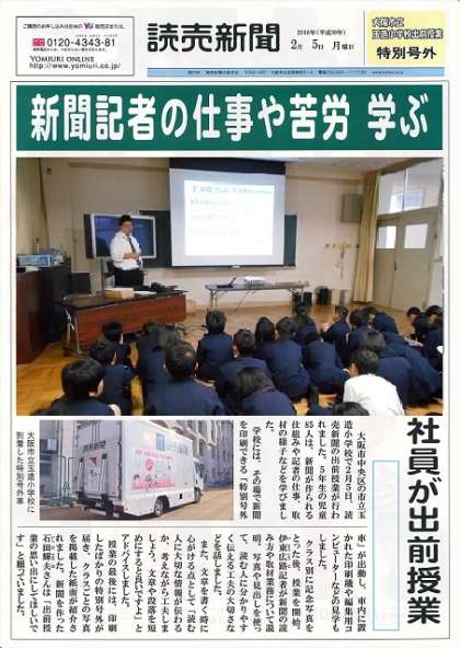 2月5日(月)5年は、読売新聞社の方に来ていただき、新聞ができるまでを教えていただきました。出前授業の最後には、玉造小学校号外新聞をこの時間内に作っていただきました。