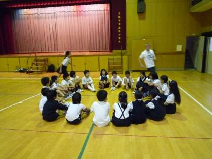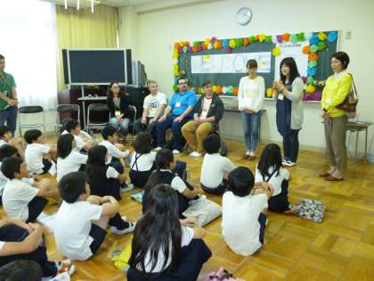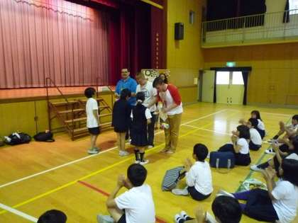 5月15日(木)アメリカ合衆国のウィーバー州立大学短期語学研修団の内の3名が来校し、5年生児童と交流をしました。日本の遊びやアメリカの遊びをお互いに紹介し、一緒に楽しみました。留学生への質問タイムやリコーダー演奏と歌のプレゼントなど、短時間ではありましたが、充実した交流会になりました。