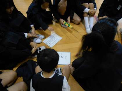 この日は、学校行事に関するジェスチャーゲームで楽しみました。班のみんなで頭を寄せ合って答えを考えていました。