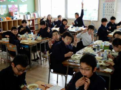 卒業まであと数日となった6年生は、卒業お祝い献立の手巻きご飯を頬張りながらクラスで会食を楽しみました。