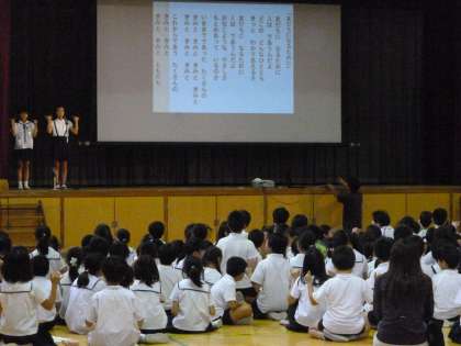 開会式では、聴覚特別支援学校の児童を、花のアーチで迎え、手話を交えた自己紹介や歌などの交流をしました。