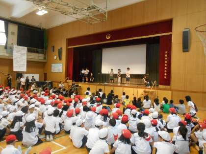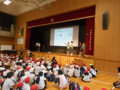 玉っ子まつりの前半と後半の間には、講堂で中央聴覚支援学校の友だちとの交流をし、「今からする手話は、何を表しているでしょう」クイズをしました。