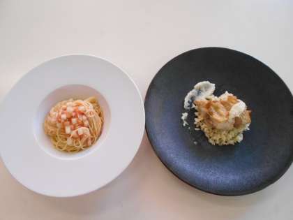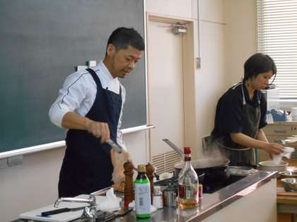 講習会では、中央区役所の方から「玉造黒門越瓜」をはじめとした中央区発祥のなにわの伝統野菜のお話を聞きました。また、校区にあるレストラン「リール」のシェフに来ていただき、玉造黒門越瓜を使った料理2品「国産鶏肉のスパイスローストと玉造黒門越瓜のハーブライスと玉造黒門越瓜のピクルスのソース」と「玉造黒門越瓜のピクルスとトマトのジュレとベーコンの冷製スパゲッティ」を試食させていただきました。