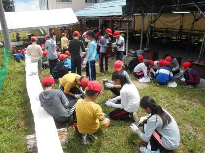 (写真上)昼からは焼き板作りを行いました。焼いた板を歯ブラシと古ぞうきんできれいに磨きました。