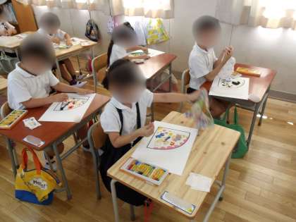 1年は図工の学習で「クラッカーをならそう!」という作品を描いています。パスを使って、クラッカーの筒のデザインを描いていきました。