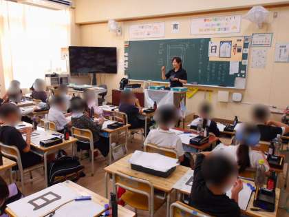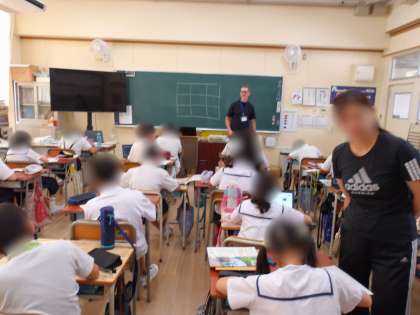 5年生はNino先生と英語の学習です。Nino先生が夏休みにしたことを想像して、9つのマスに書き、英語で尋ねながらビンゴゲームを楽しみました。