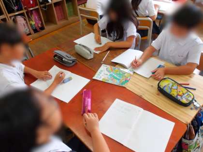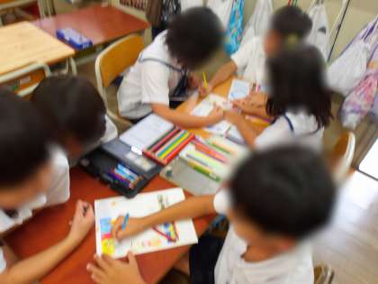 2年生は学級活動の時間です。2学期から新たに活動する係のメンバーで集まり、係ポスターを作りました。係のしごと、がんばろう!