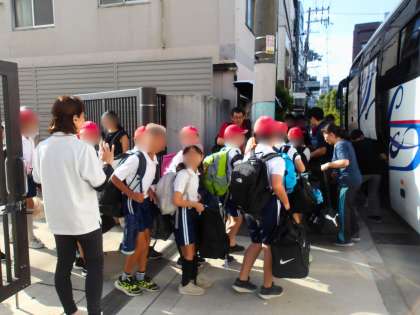 5年生は、今日・明日と滋賀県マキノ方面に林間学習に行きます。運動場で出発式を行い、ルール・マナーを守って楽しい林間学習にすることを確かめ、いざ出発です。