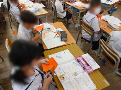 2年生は算数の学習をしています。折り紙のふちを切って、楕円のような形をつくり、その端を折って四角形をつくりました。できた四角形をもとにその特徴を交流しました。