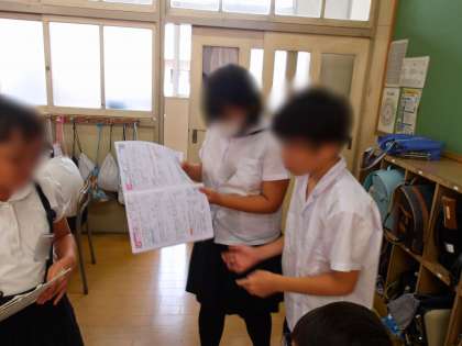 6年生は国語「模型のまち」の学習です。前回はこのお話の初発の感想を交流しましたが、今日は文章中の表現の工夫について交流しました。