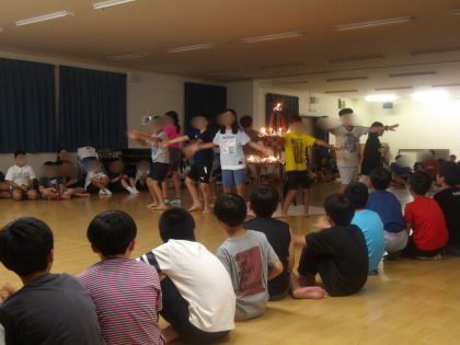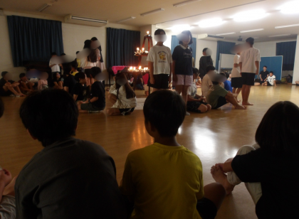 多目的ホールでキャンドルサービスを楽しみました。広間の中央に置かれた燭台に点火をした後は、それぞれの学級のスタンツや係の出し物でたいへん盛り上がりました。ダンスやクイズ、怪談話などで、とても楽しく過ごしました。