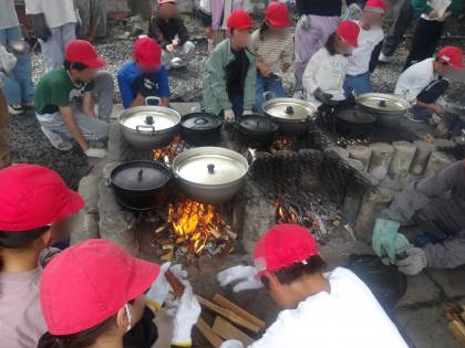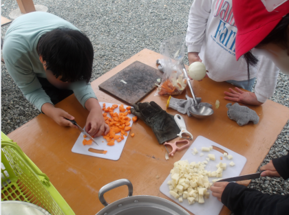カレーライスづくりにチャレンジしました。宿舎の方から説明を聞いた後、カレーとごはんを作ります。ご飯はダッチオーブンで炊きました。かまどの係は、煙と格闘しながら火の番をがんばりました。なかなか火がつかず苦労した班もありました。