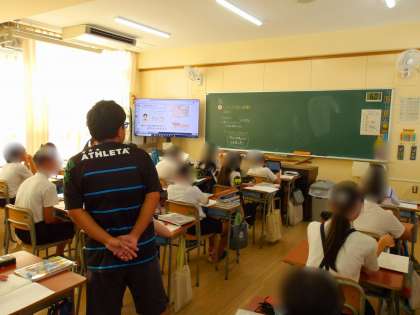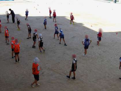 5年生は体育でリレー走の学習をしています。リレー走ではバトンパスをしますが、早くスムーズにバトンパスを行うにはどうすればよいか、グループで話し合いながら取り組みました。