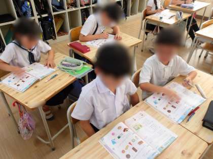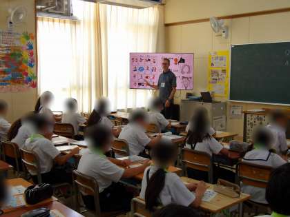 5年生は外国語の学習です。"Can you 〜?"から始まる英語の様々な問いについて、自身の答えをカードに英語で書き、実際にそれを使って友だちと尋ね合いました。