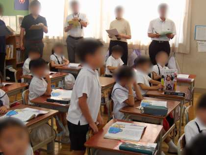 1年生で道徳の研究授業があり、他の小学校からもたくさんの先生が見に来てくれました。今日は「おおひとやま」というお話です。