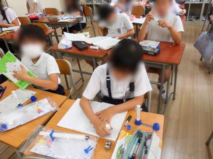 4年生は理科の学習です。空気でっぽうの玉がとぶのは、おし縮められた筒の中の空気が、元に戻ろうとする力がはたらいていることがわかりました。