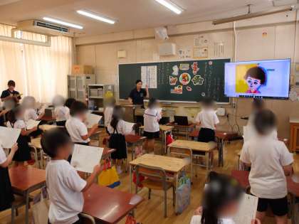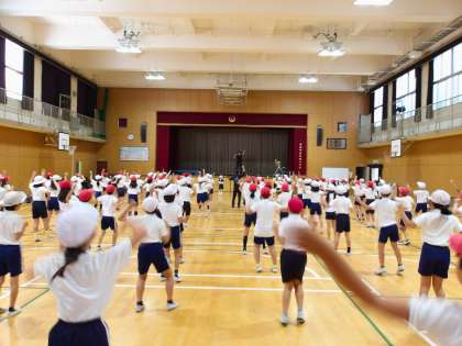 3年生は運動会の団体演技の練習です。短い動きを少しずつマスターして、それらの動きを曲に合わると、格好いいダンスになっていました。