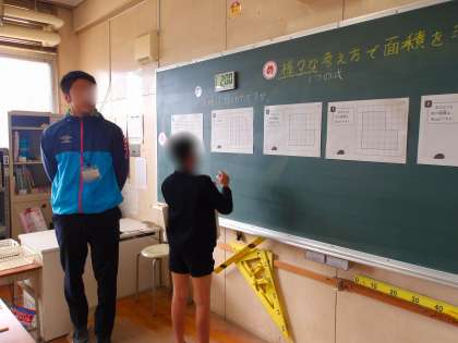 4年生は算数で「面積」の学習をしています。四角形でないかいだんのような形を工夫して四角形にして、面積を求めました。