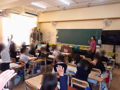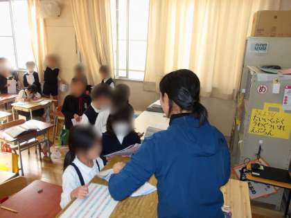 1年生は算数の学習です。「たし算」「ひき算」の復習問題に取り組みました。先生に〇をもらうために、子ども達は意欲的に練習問題に取り組みました。