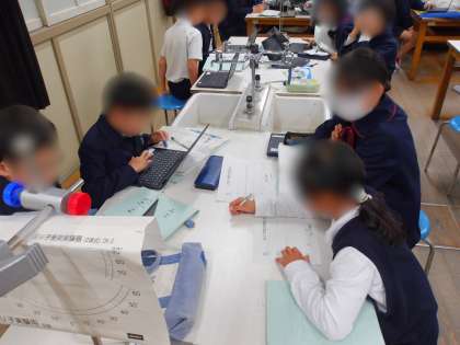 5年生は理科の学習です。ふりこの「おもりの重さ」「糸の長さ」「ふり幅」を変えてふりこの周期を調べた結果をグループで話し合い、考察をまとめました。
